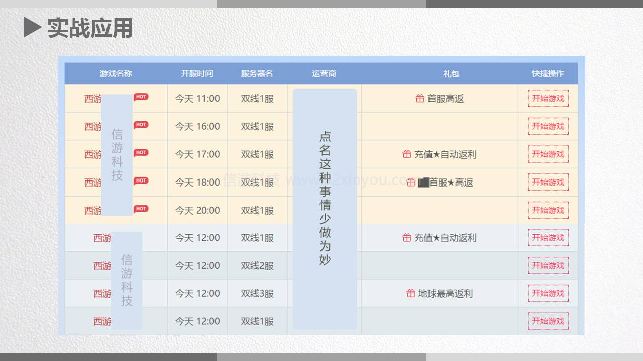 咱们用开服表举个例子:当你看到这些游戏时,你是一个玩家你会选择哪个游戏进?开服表的玩家都是一些游戏的资深玩家,没玩过的不知道找开服表,所以开服表导量很重要。这些开服信息区别在哪里呢?加了推荐的一般是花了钱的,那都加了推荐选择哪个呢?第一点区分开服时间,比如都是12点开,你可以11点或者13点开。第二点注意服,双线1服肯定是大家都爱玩的,资深玩家就会知道,1服最早开,他最早进服去练,以后合服他也是老人,享受的资源玩的时间都比别人长;第三点,运营商这个就没什么可改变的了,第四最后边的礼包,其实就是广告语,像这些什么都没写的肯定不如有标语的,写了广告语的几乎都是在写返利,如果这时你写的是高返利+美女陪玩,点美女陪玩的是不是比别人的几率更高,都是送首冲你送条狗行不行,同样是花钱你做到比旁边几个有吸引力,那你这条广告做的就比别人值,比别人有吸引力。之前说过开服表软件不要用,因为那个都是盲发,不知道对手发的是什么,咱们媒介要进来看看竞争对手发的是什么不要盲发,要比对手吸引眼球,这条广告花的就值。