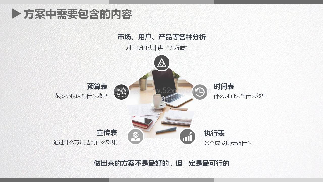 对于新入行的小白来说,咱们做的方案不是最好的,但是一定是最可行的,最符合团队现在的情况。一定要在自己的可执行范围内制作最可行的方案,不要眼高手低急于求成。